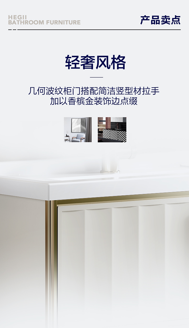 - 幾何波紋柜門搭配簡潔豎型材拉手,加以香檳金裝飾邊點綴。