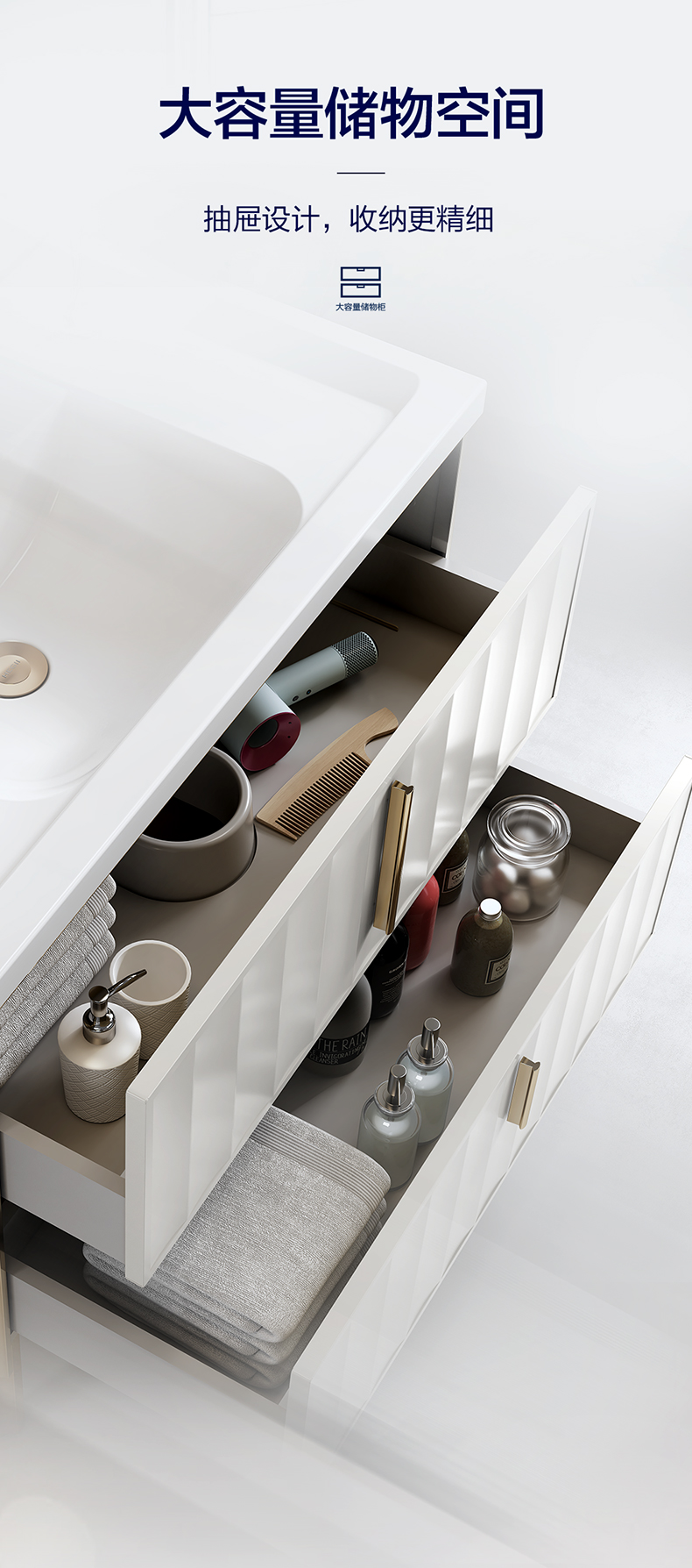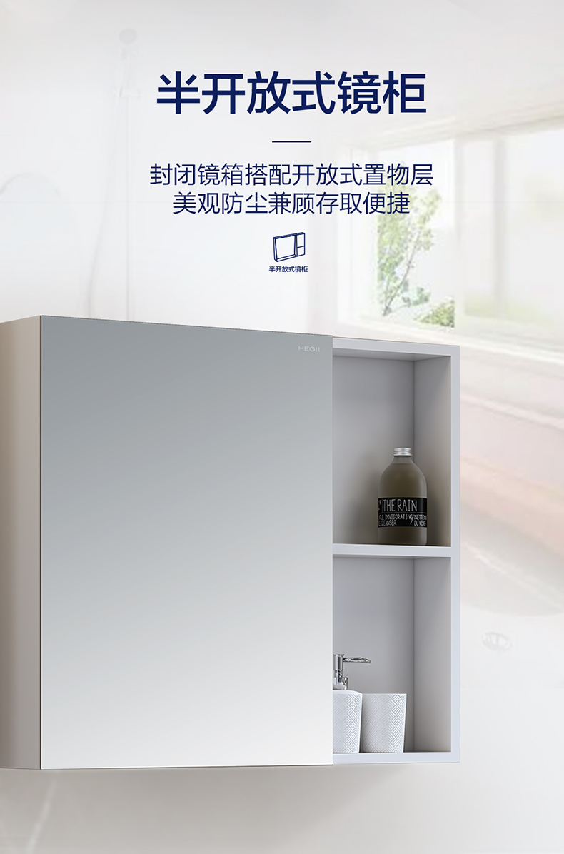 - 封閉鏡箱搭配開放式置物層,美觀防塵兼顧存取便捷