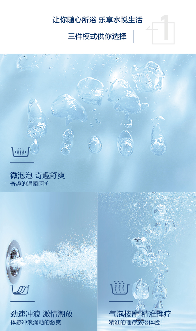 勁速沖浪按摩系統、微泡泡按摩系統及汽泡按摩系統三件模式供你選擇,讓你隨心所浴,樂享水悅生活